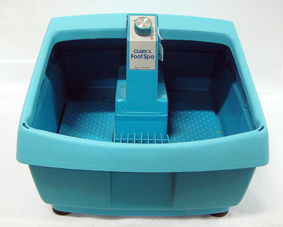 Nuddtæki. Fótanuddtæki, kassi úr harðplasti grænblár að lit. Liggur á fjórum svörtum gúmmítöppum, að ofan er op til að stinga fótunum í, efst á kassanum er rofi til stillingar og vörumerki GLAROL Foot Spa. Neðst er hólf með samanvöðlaðri rafmagnssnúru. Tækið er framleitt í Danmörku. Var í eigu hjónanna Unnar Aradóttur Hagalín og Guðmundar Gíslasonar Hagalín. Tæki sem þessi voru flutt til Íslands í hundruðatali eftir árangursríka söluherferð um 1980. Hurfu jafnskjótt úr notkun og þau komu á markaðinn.