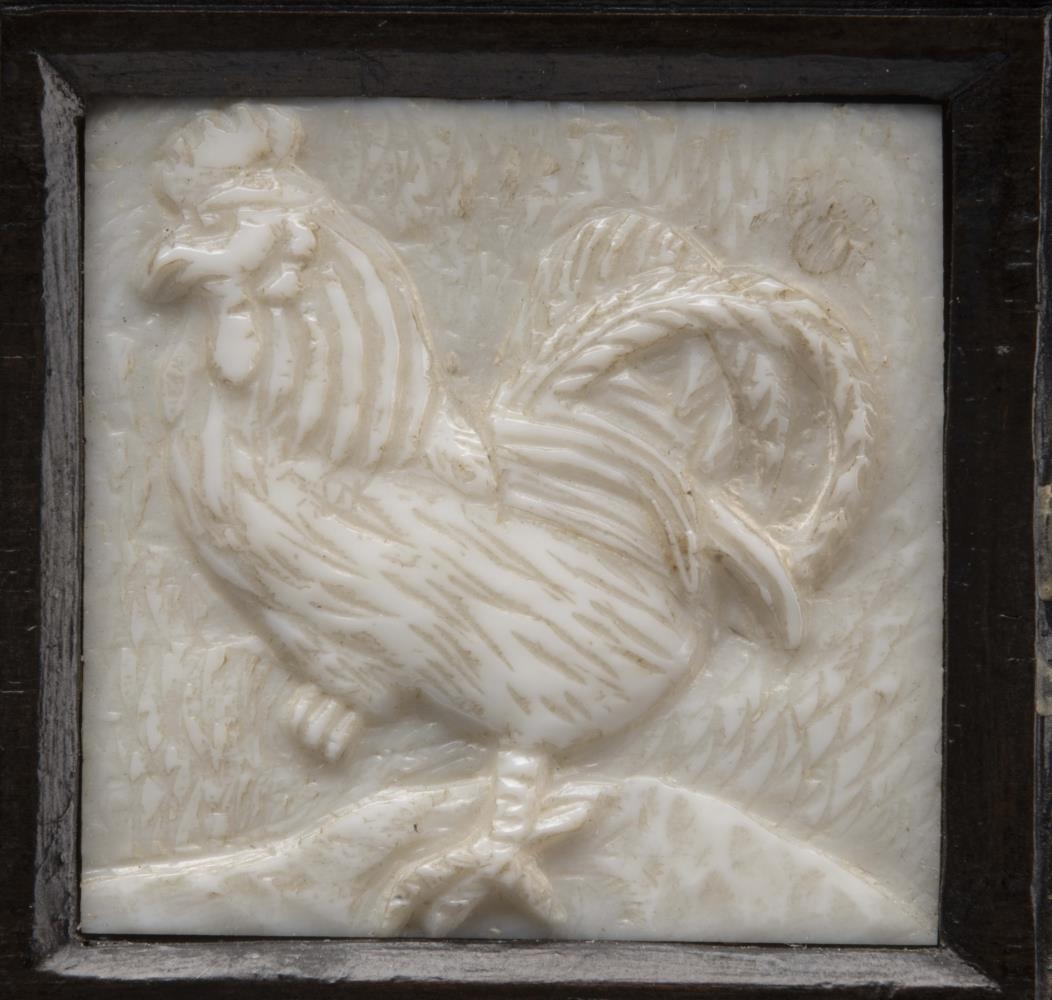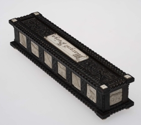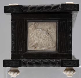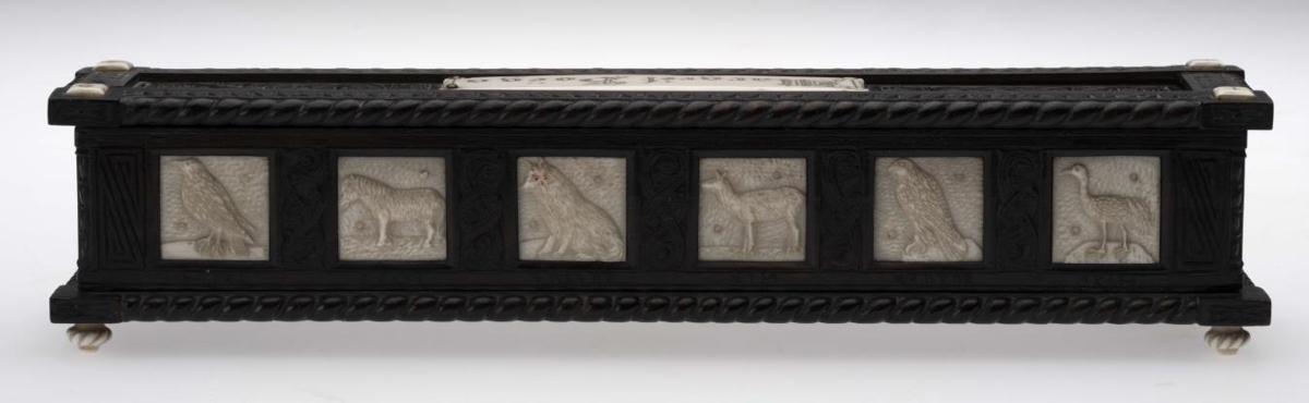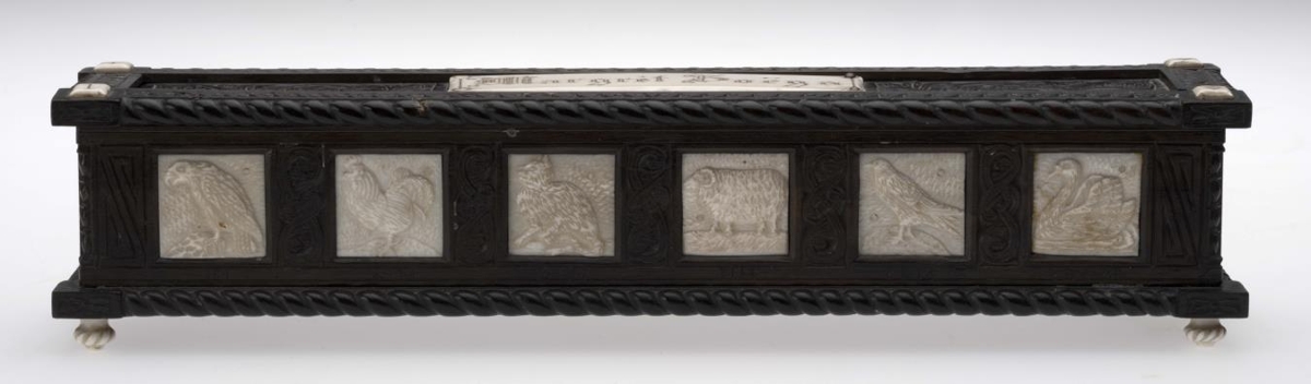 Fyrir miðju loksins er plata úr fílabeini, nafnið Margrét Zoëga er grafið í hana. Platan er fest með smágerðum nöglum í hverju horni. Tölustafir grafnir í ferhyrnta fílabeinsfleti skreyta hornin á stokknum ofanverðum. Saman mynda stafirnir ártalið 1919. Stokkurinn er á fjórum skornum fótum, einnig úr fílabeini. Sex dýramyndir, skornar í fílabein, skreyta hvora langhlið stokksins. Ein mynd er á hvorri skammhlið. Fyrir neðan myndirnar eru heiti dýranna með rúnaletri og saman mynda þau vísu.