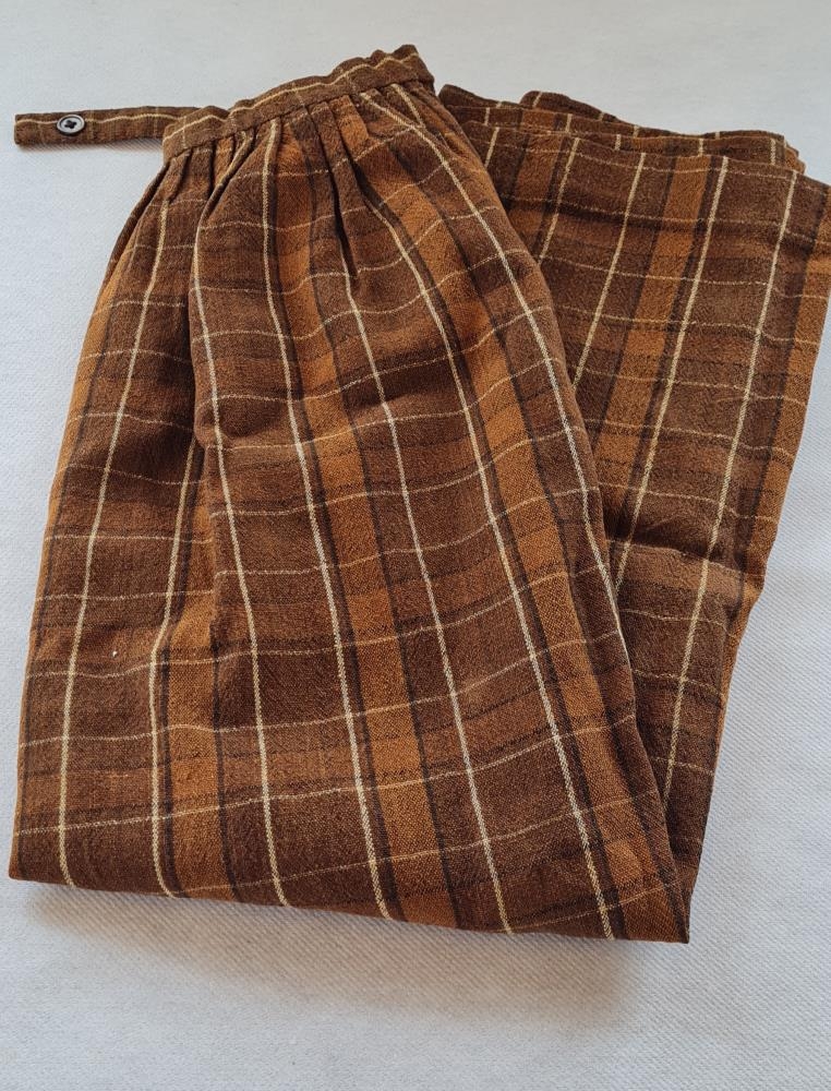 Ofin svunta í nokkrum mórauðum llitum. Ljós þráður myndar ferninga í klæðinu. Á miða sem festur var við svuntuna stendur:"Guðrún Jónsdóttir frá Vakursstöðum spann í svuntudúkinn. Jóhann á Breiðumýri, faðir Sigríðar Jóhannsdóttur frá Breiðumýri óf vefinn.