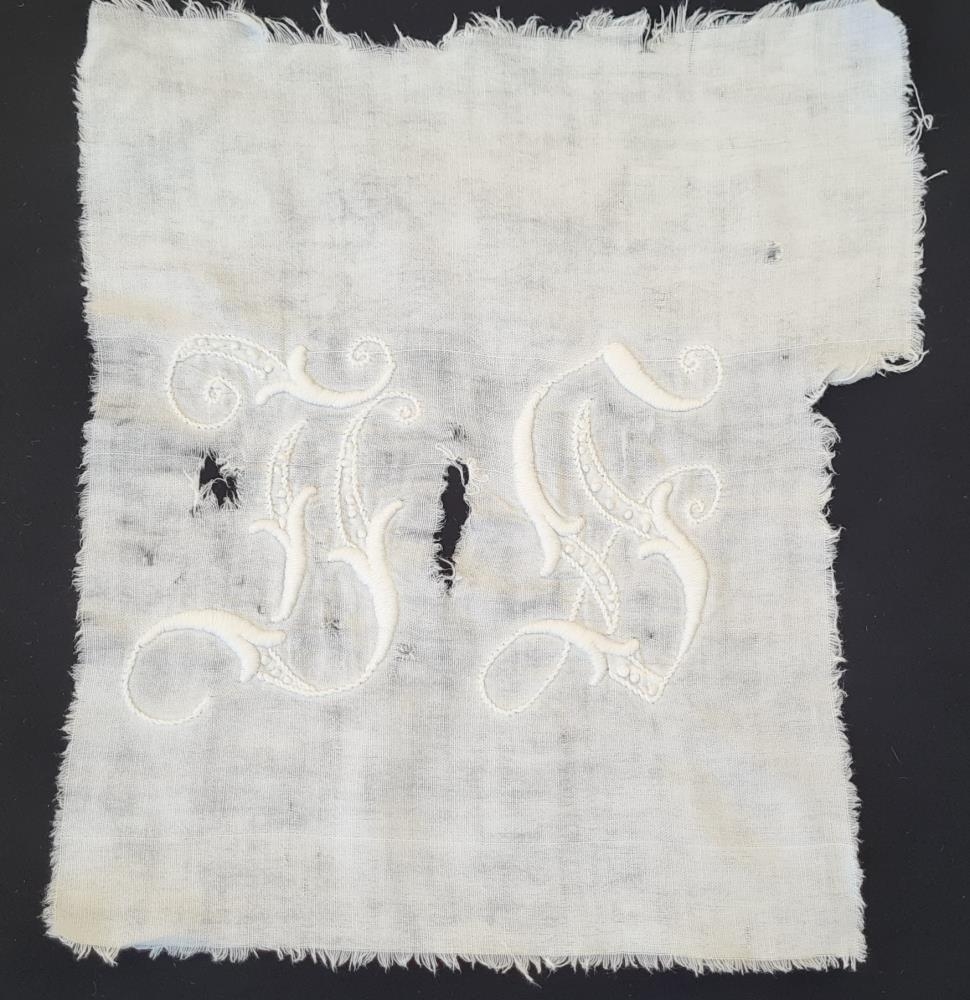 Útsaumaðir stafir; JS. Hluti af sængurveri sem hefur verið orðið mjög slitið. En útsaumurinn hefur varðveist. Eign og handverk Jóhönnu Sigurjónsdóttur (1900-1992) Kolbeinsgötu 2 (Baldursheimur) Vopnafirði. Áður húsfreyja á Ljótsstöðum Vopnafirði frá 1923-1966. Gefandi er dóttir hennar.
