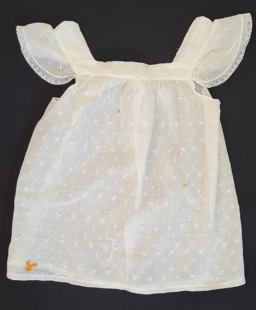 Svuntukjóll úr þunnu hvítu efni með upphleyptum blómum. Opinn í bakið en tvær tölur eru upp við hálsmálið. Átti Jóhanna Sigurjónsdóttir (1900-1992) Kolbeinsgötu 2 (Baldursheimur) Vopnafirði. Áður húsfreyja á Ljótsstöðum Vopnafirði frá 1923-1966. Gefandi er dóttir hennar.