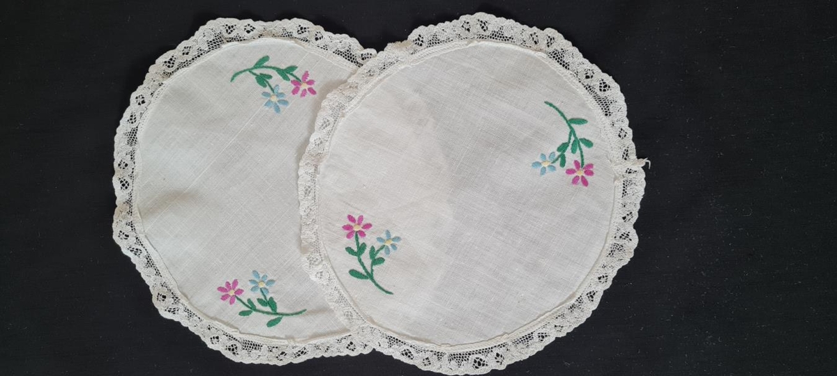 Tveir kringlóttir smádúkar. Útsaumuð blóm í bláum,bleikum og grænum lit. Flatsaumur og kontorstingur. Eign og handverk Önnu Sigiurðardóttur Felli Vopnafirði.
