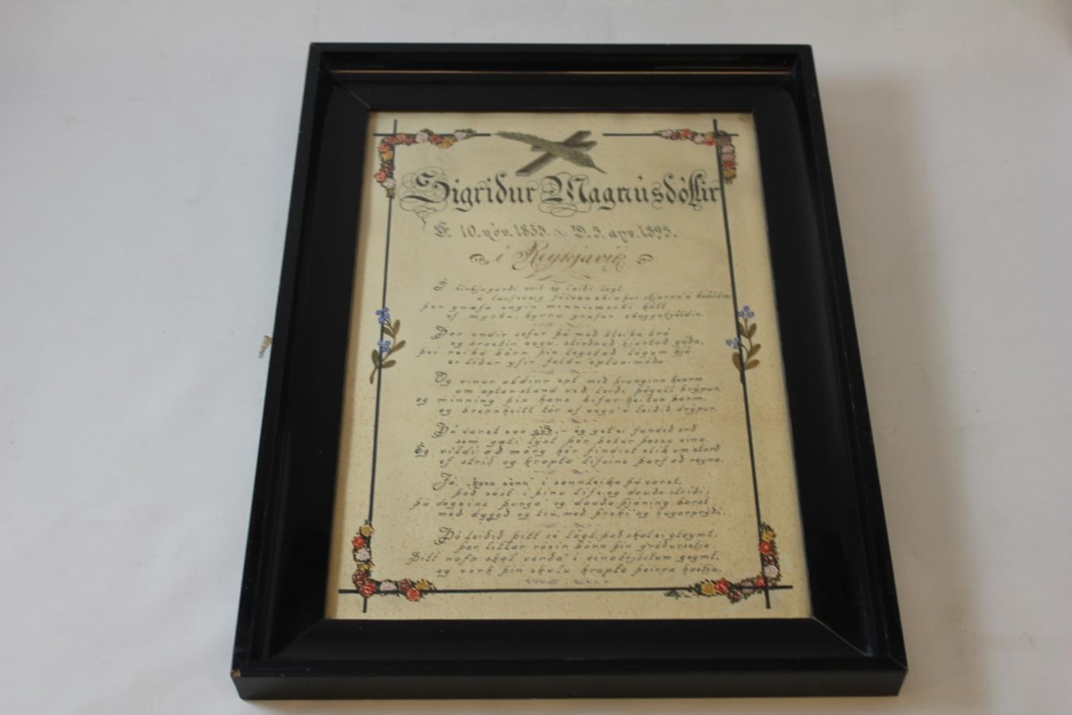 Minningarspjald í ramma um Sigríði Magnúsdóttur, f. 1835, d. 1895.