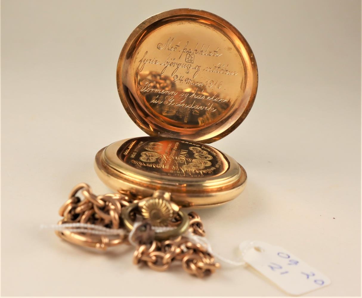 Gullvasaúr, Invar Swiss. Áletrun innan á lokið: "Með þakklæti fyrir björgun og viðtökur 24.mars 1916. Formenn og hásetar úr Grindavík.