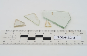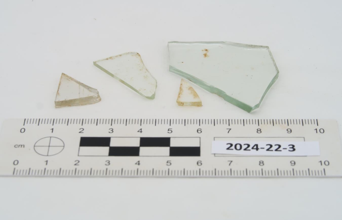 Fjögur glær og slétt glerbrot. Eitt brotið er stærst, þykkara en hin og aðeins grænleitt.