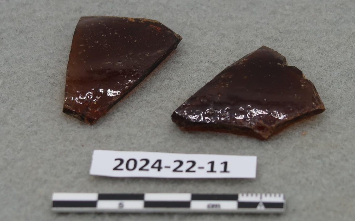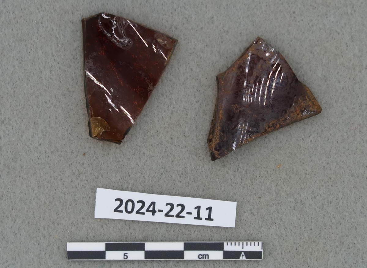 Tvö brún ávöl glerbrot, mögulega úr sama ílátinu. Smá "appelsínuhúð".