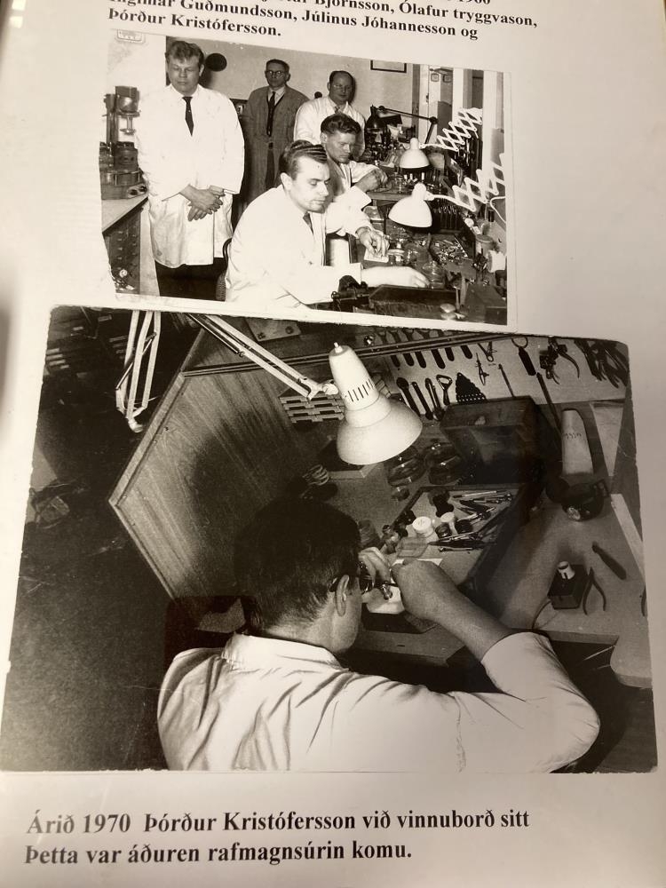 Innrömmuð ljósmynd frá úraverkstæði Magnúsar Benjamínssonar um 1960 og sérmynd af Þórði við starf sitt, samsettar, undir gleri, 40 x 30 cm. Gefandi Þórður Kristófersson úrsmiður, Ljárskógum 14, Reykjavík. Hann er sonur Kristófers silfursmiðs á Kúludalsá frá Stóru-Borg.