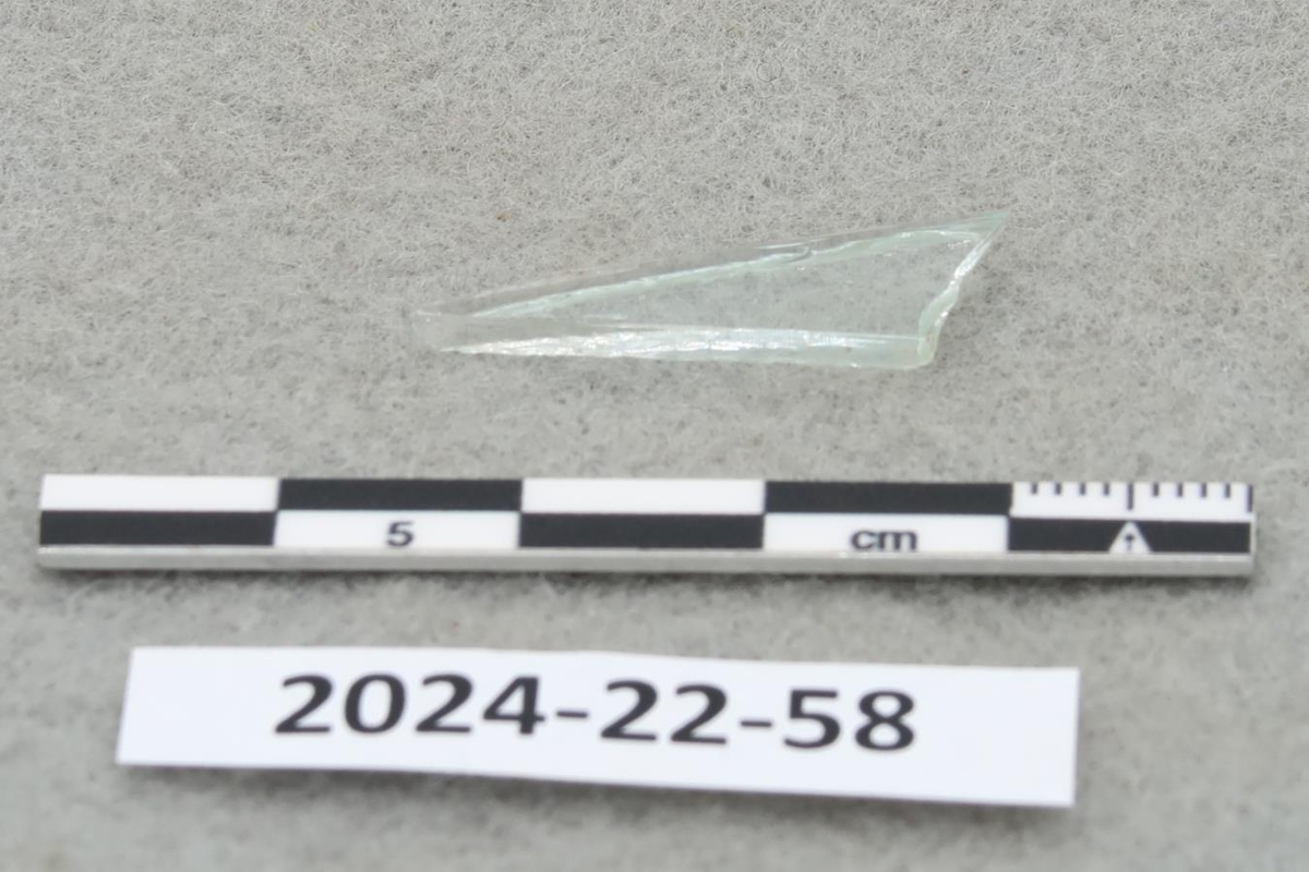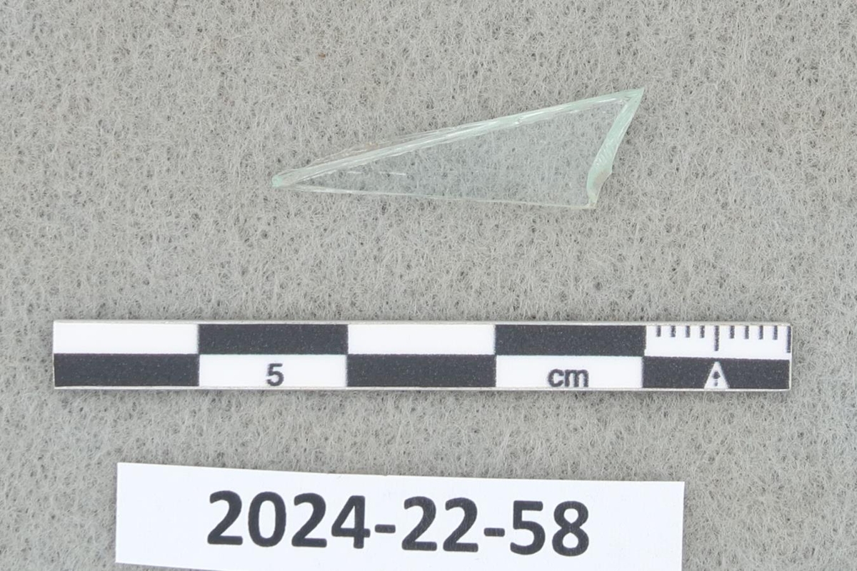 Þríhyrnt slétt og glært glerbrot, sennilega rúðugler.