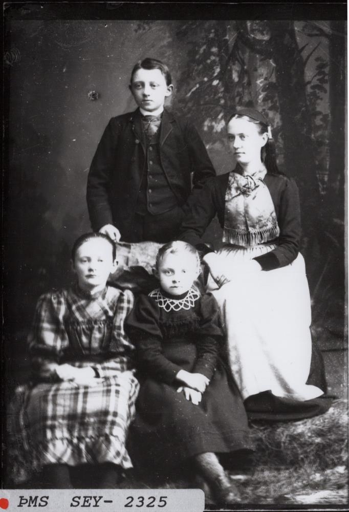 Hópmynd. Kona, tvær stelpur og einn drengur.