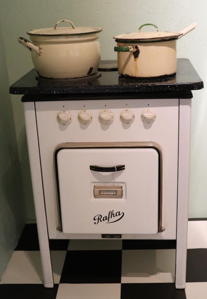 Eldavél: Gerð: “Rafha”. Var í eigu Geirs Bachmann og Jórunnar Guðmundsdóttur Bachmann. Færðir safninu af Guðmundi og Sigríði Bachmann. Kom ásamt munum nr. 3875-3929.