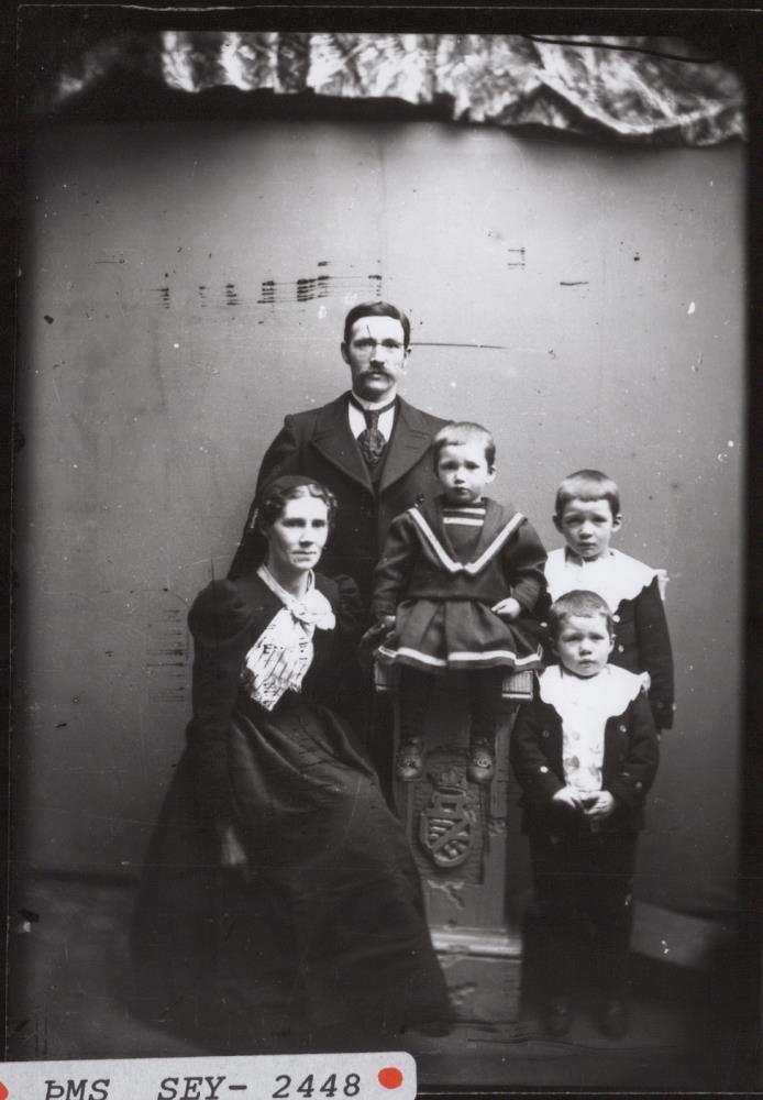 Hjónin Magdalena Sigríður Árnadóttir og Ellert Kristófer Schram seglasaumari og synir þeirra Karl Jóhann, Kristján og Gunnar.