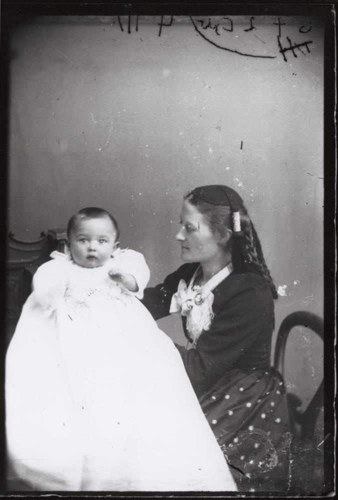 Guðrún Brynjólfsdóttir frá Engey heldur á ungabarni sínu sem er klætt í hvítan skírnarkjól. Maður Guðrúnar og faðir barnsins var Þorsteinn Þorsteinsson skipstjóri.