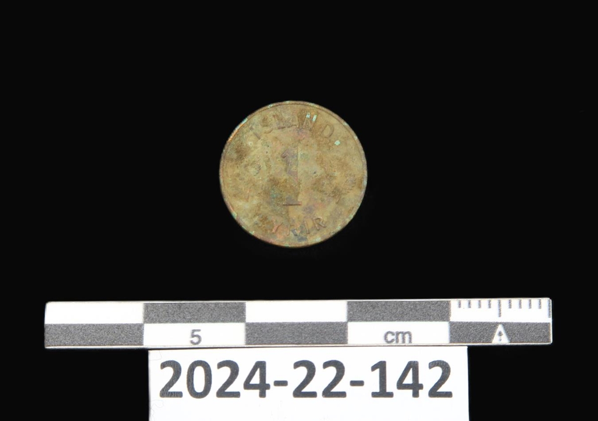 On the second face of the coin are the words: Ísland, 1, Eyrar. Either side of the 1 are two leaf patterns, each with two stems and three leaves.