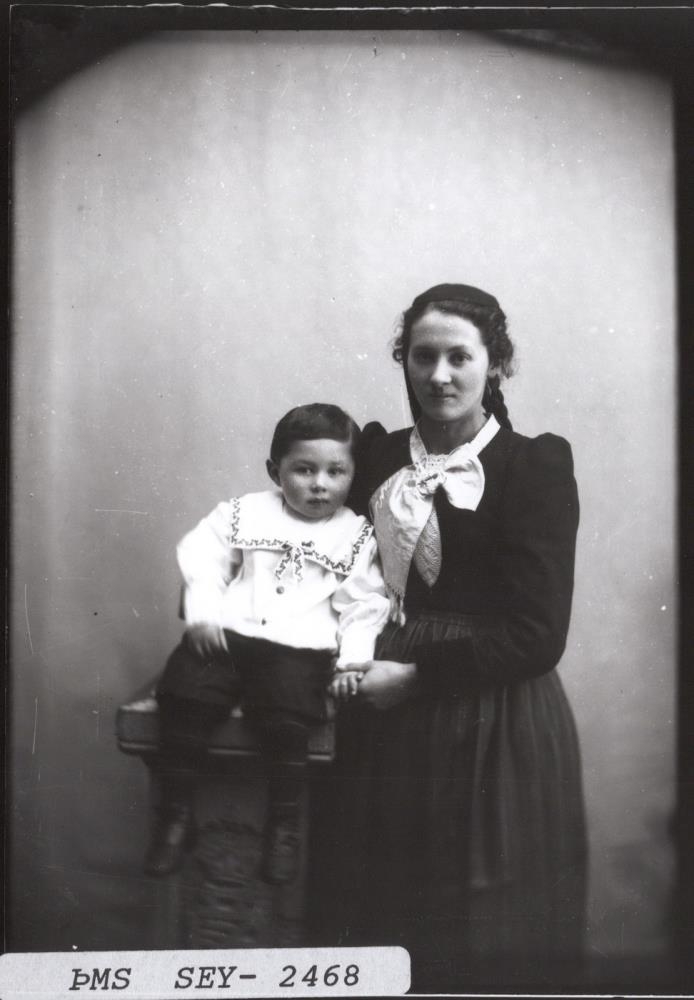 Guðríður Brynjólfsdóttir frá Engey, við hlið hennar situr lítill dökkhærður drengur. Sennilega systursonur hennar sem systir hennar Guðrún Brynjólfsdóttir átti með Þorsteini Þorsteinssyni skipstjóra.