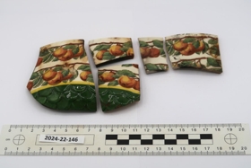 Fimm brot af leiríláti með ferskjumunstri og grænu hreistursmunstri við botninn. Öll brotin passa saman.