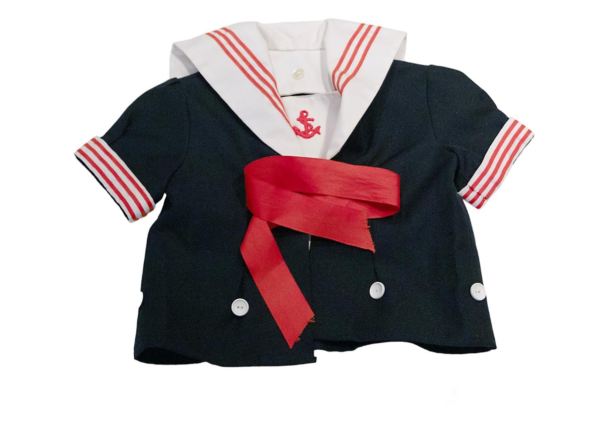 Stutterma matrósatreyja blá að lit með stórum hvítum kraga með rauðum bryddingum á og rauðri slaufu.
