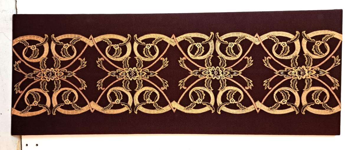 Útsaumað veggteppi eftir Ásrún Einarsdóttir frá Stóru-Laugum í Reykjadal. Dökkbrúnn ullarjavi sem saumað er út í með jurtalituðu bandi í ljósum tónum. Útsaumsaðferðir eru refilsaumur, kontorstingur og mislöng spor.Teppið er strekkt á tréramma.
