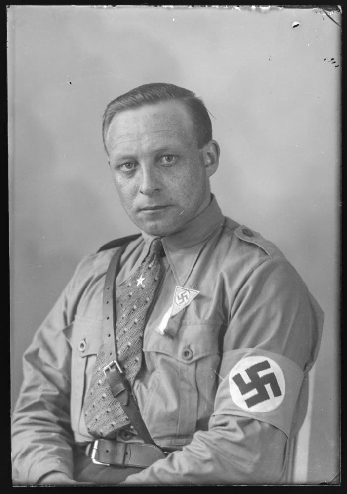 Karlmaður í nasistabúning. Myndir frá Ljósmyndastofu Jóns J. Dahlmann og Þorleifs K. Þorleifssonar.