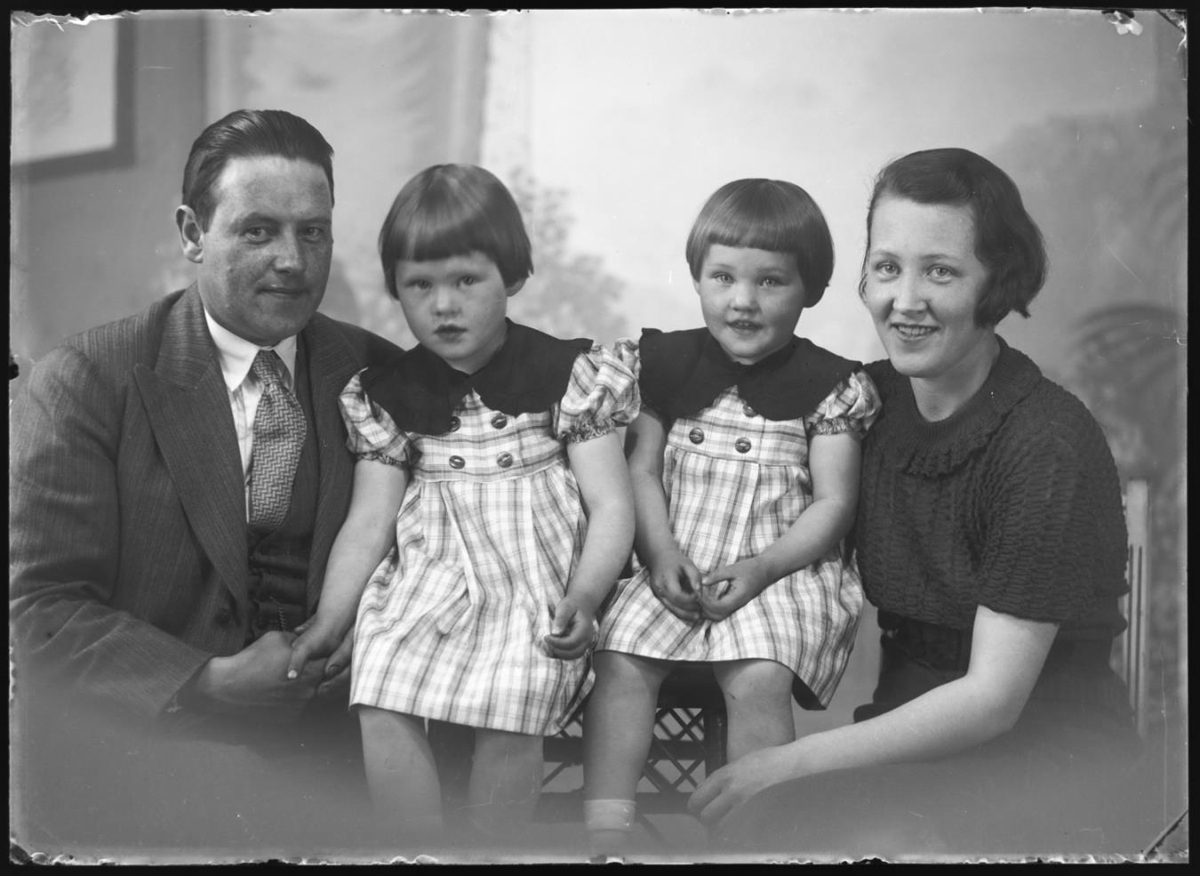 Hjón með tvær stúlkur á milli sín. Sigurður, Ebba, Jóhanna og Guðlaug Dahlmann. Myndir frá Ljósmyndastofu Jóns J. Dahlmann og Þorleifs K. Þorleifssonar.