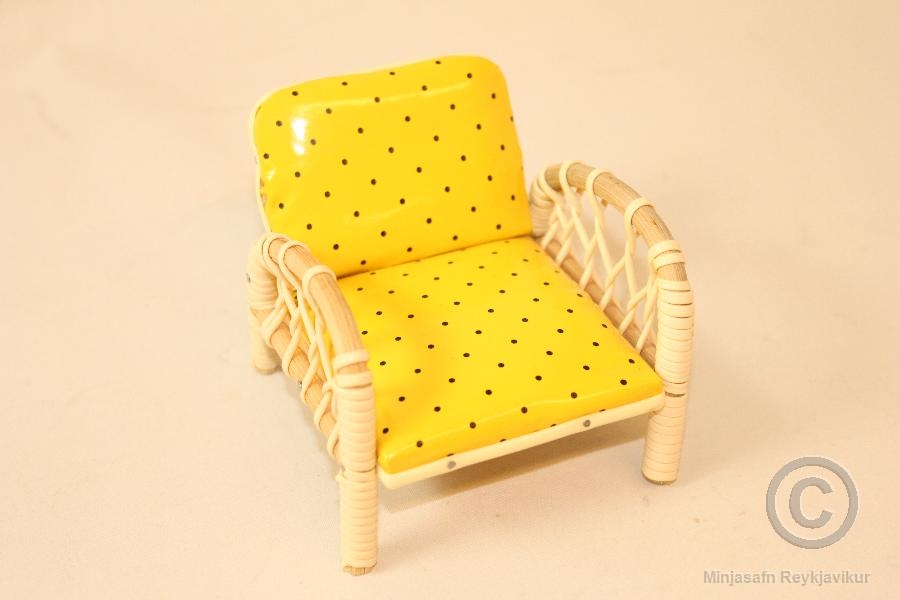 Baststóll með gulu plastáklæði með svörtum doppum. Leikfang.