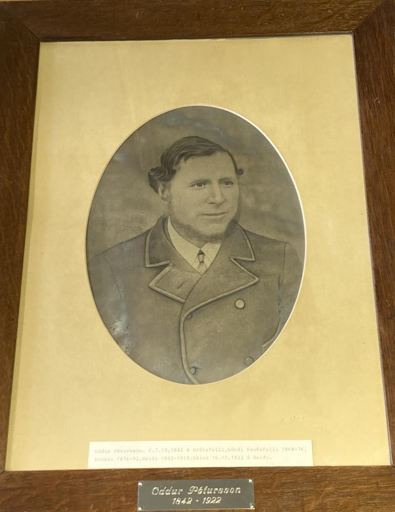Innrömmuð ljósmynd; Oddur Pétursson f. 7.10.1842 á Hrútafelli, bóndi á Rauðafelli 1868-76, á Krossi 1876-92 og á Heiði 1892-1919. d. 16.11.1922 á Heiði. Fyrri kona Odds var Sigríður árnadóttir (1840-85) frá Skálakoti og áttu þau 7 börn, seinni kona Odds var Guðbjörg Filippusdóttir (1855-1918) frá Norður-Móeiðarhvolshjáleigu og áttu þau 3 börn. Myndin er af Oddi um fertugt. Eigandi myndarinnar, Oddur Árnason (1913-1997) frá Hrólfstaðahelli, dóttursonur Odds og Sigríðar ráðstafaði myndinni til Skógasafns að sér gengnum.