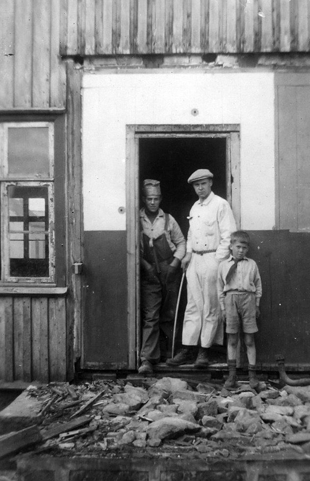 Unnið við að breyta Norðfjörðshúsi í samkomuhús fyrir U.M.F.K. Í dyrunum standa frá vinstri: (Addi Fúsa) Árni Vigfússon, (Óli Þorsteins) Ólafur A. Þorsteinsson og með þeim er Ragnar Friðriksson.