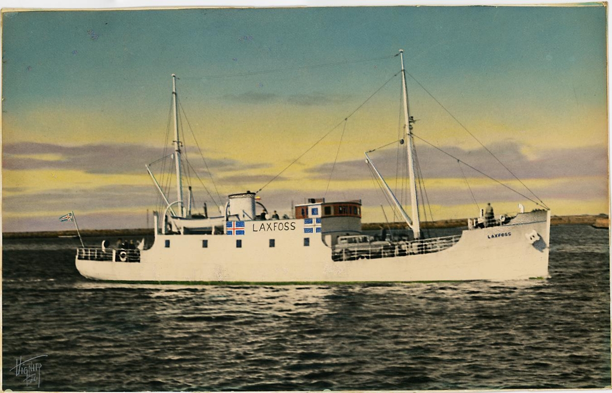 Laxfoss var strandferðaskip, smíðað í Álaborg í Danmörku árið 1935 fyrir Skallagrím hf. í Borgarnesi. Hann var í ferðum á milli Reykjavíkur, Akraness og Borgarness og fór eina ferð á mánuði til Breiðafjarðar að vetri til. Á stríðsárunum 1941 og 1942 fór hann eina ferð á viku Vestmannaeyja að vetri til og finna má mynd af skipinu þar í bókinni Íslensk skip. Þann 10. janúar 1944 strandaði skipið við Örfirisey með 13 manna áhöfn og 78 farþega um borð. Mannbjörg varð og skipið náðist aftur út. Gert var við það og um leið lengt um 2,2 metra. Viðgerð lauk árið 1945 og þá var aftur haldið uppteknum hætti við siglingar, einkum í Faxaflóa. Þessi mynd er því tekin eftir að viðgerðum lauk. Þann 18. janúar 1952 lauk Laxfoss siglingum sínum þegar hann strandaði í leiðindaveðri við Kjalarnestanga. Enn varð mannbjörg, en í þetta sinn lifði Laxfoss ekki af