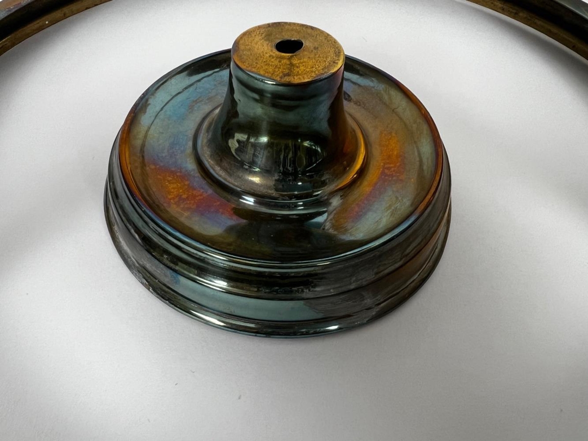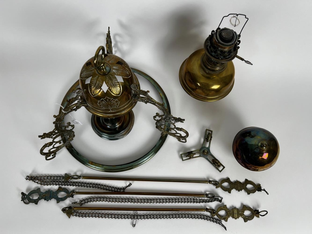 Veglegur olíulampi úr málmi skrautflúraður með glæran innri gler kúpul og hvítan gler skerm. Ætlaður til upphengingar.