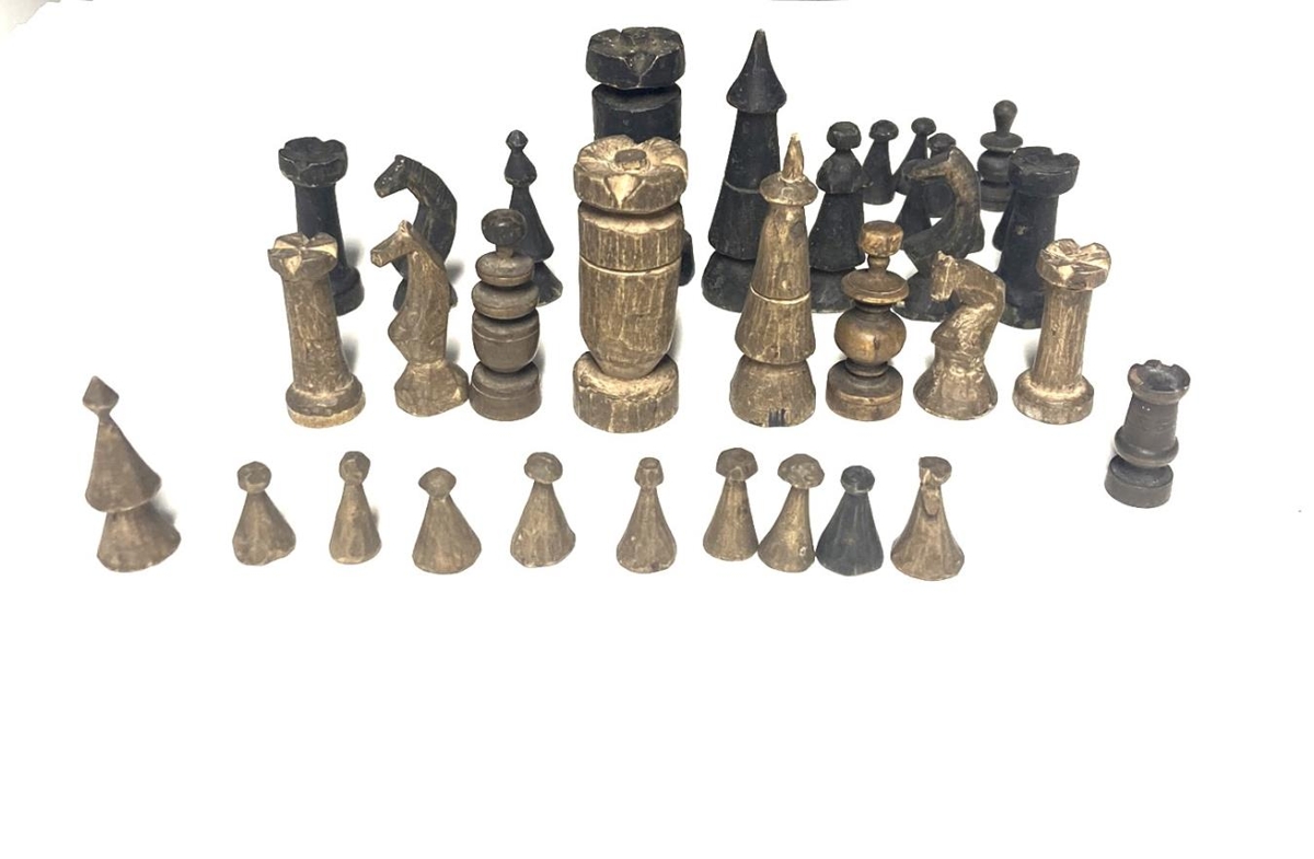 Pjáturbox með 35 taflmönnum. Sumir með fínni rennismíði, aðrir tálgaðir. Á botni dósarinnar miði sem tengir taflið við Ágúst Auðunsson á Minnivöllum, f. 2.ágúst 1909. Ásgeir bróðir hans gaf. Ætla má að heimagerði hluti taflsins sé frá um 1930 og gerður í Svínhaga. Þeir eru tálgaðir af Ágústi og bræðrum hans (Heimild: Bragi Thorarensen).