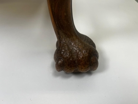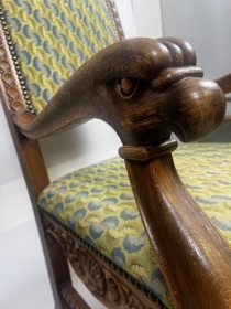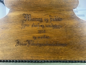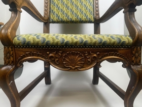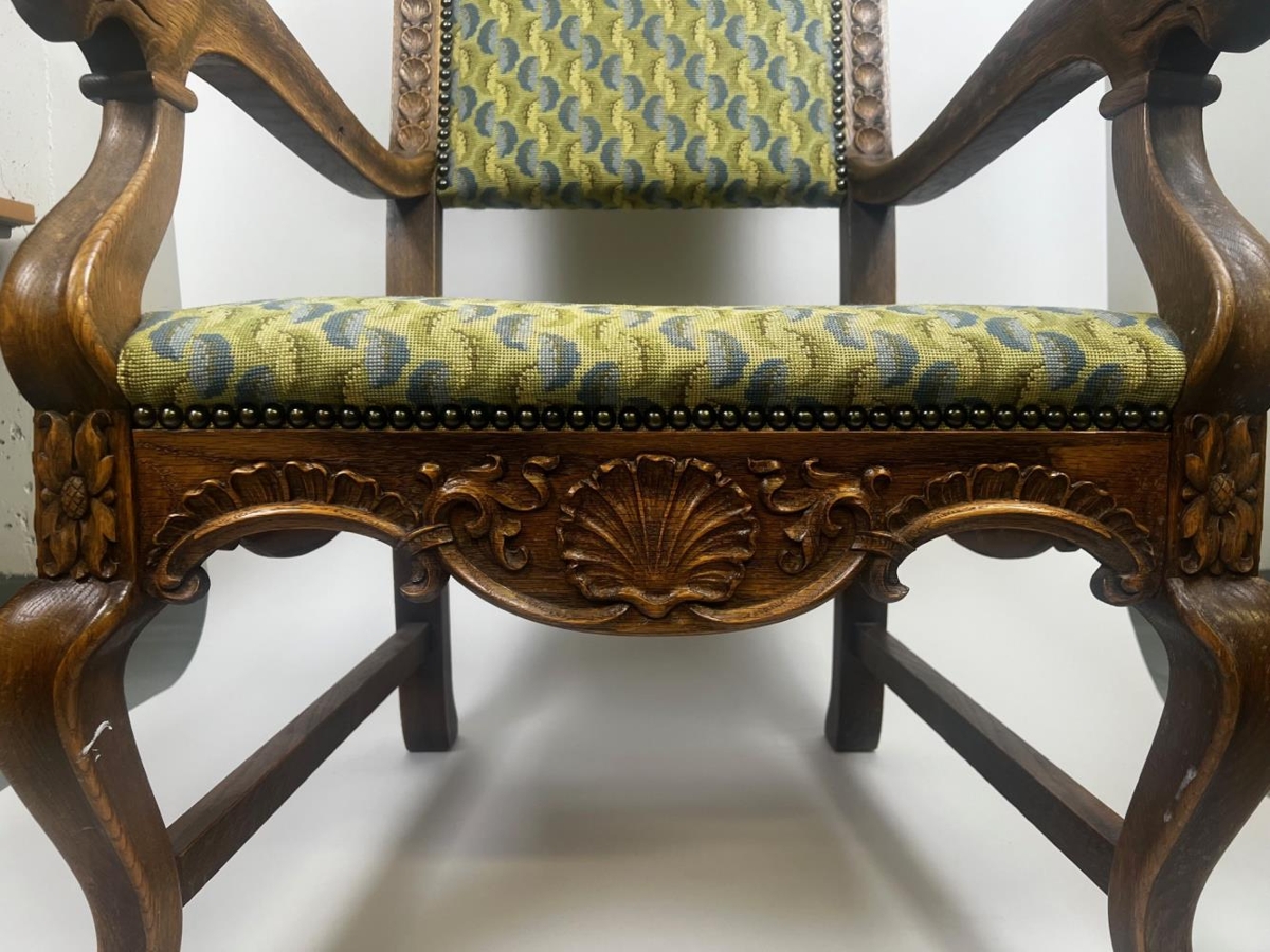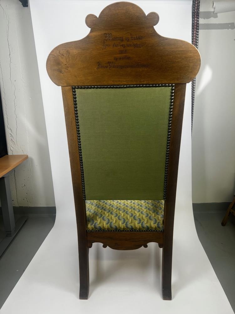 Stór og mikill viðhafnarstóll. Viðarrammi með útskornu flúri og nafni eiganda. Sessa og bak bólstrað með útsaumuðu efni í grænum tónum.