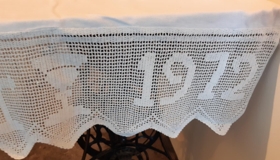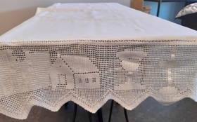 Altarisdúkur með heklaðri blúndu með pinnahekli á þrjár hliðar dúksins. Að framan er kross, kaleikur og kross og fyrir miðju fangamark krists og svo aftur kross og kaleikur og kross. Á öðrum enda dúksins er kross og kaleikur og ártalið 1972 en á hinum enda hans eru stafirnir P.Þ.J. (Pétur Þ. Ingjaldsson) og þar undir D.J. (Dómhildur Jónsdóttir) þá hekluð mynd af Hofskirkju og svo kaleikur og kross.