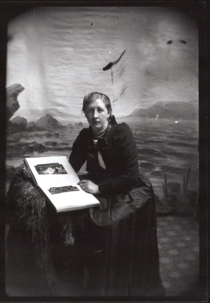 Sigríður Þorsteinsdóttir Maack frá Víðivöllum. Hún heldur á opnu myndaalbúmi.