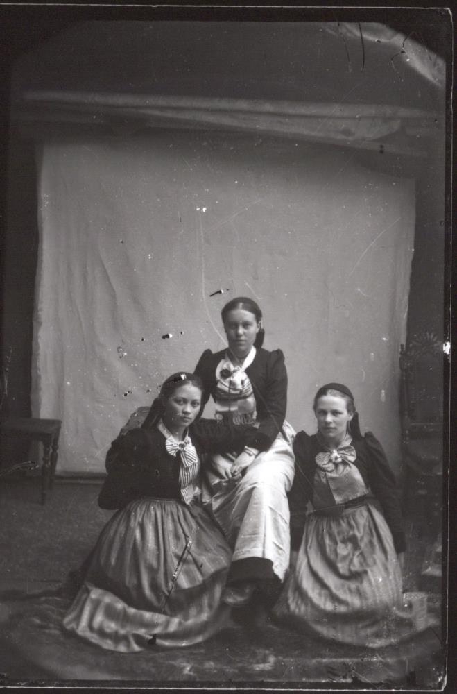 Þrjár konur í peysufötum. Lengst t.v. er Þorbjörg Sigurðardóttir g. Bergmann frá Pálsbæ á Seltjarnarnesi, hannyrðakona, rak vefnaðavöruverslun í Hafnarfirði. Hinar eru óþekktar.