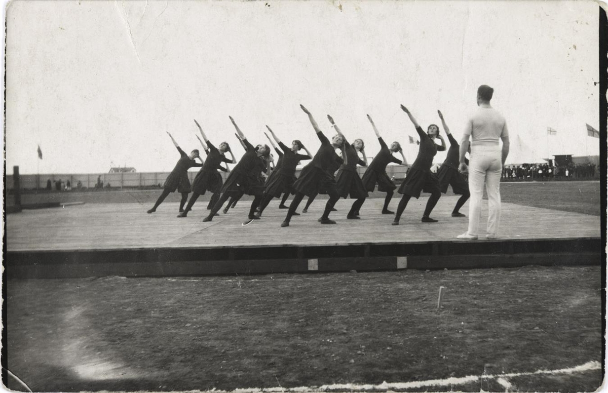 Hópur stúlkna sýnir fimleika á palli á Melavellinum. Björn Jakobsson leikfimikennari stendur hjá og stýrir sýningunni. Á bakhlið er skrifað: Björn Jakobsson ÍR.