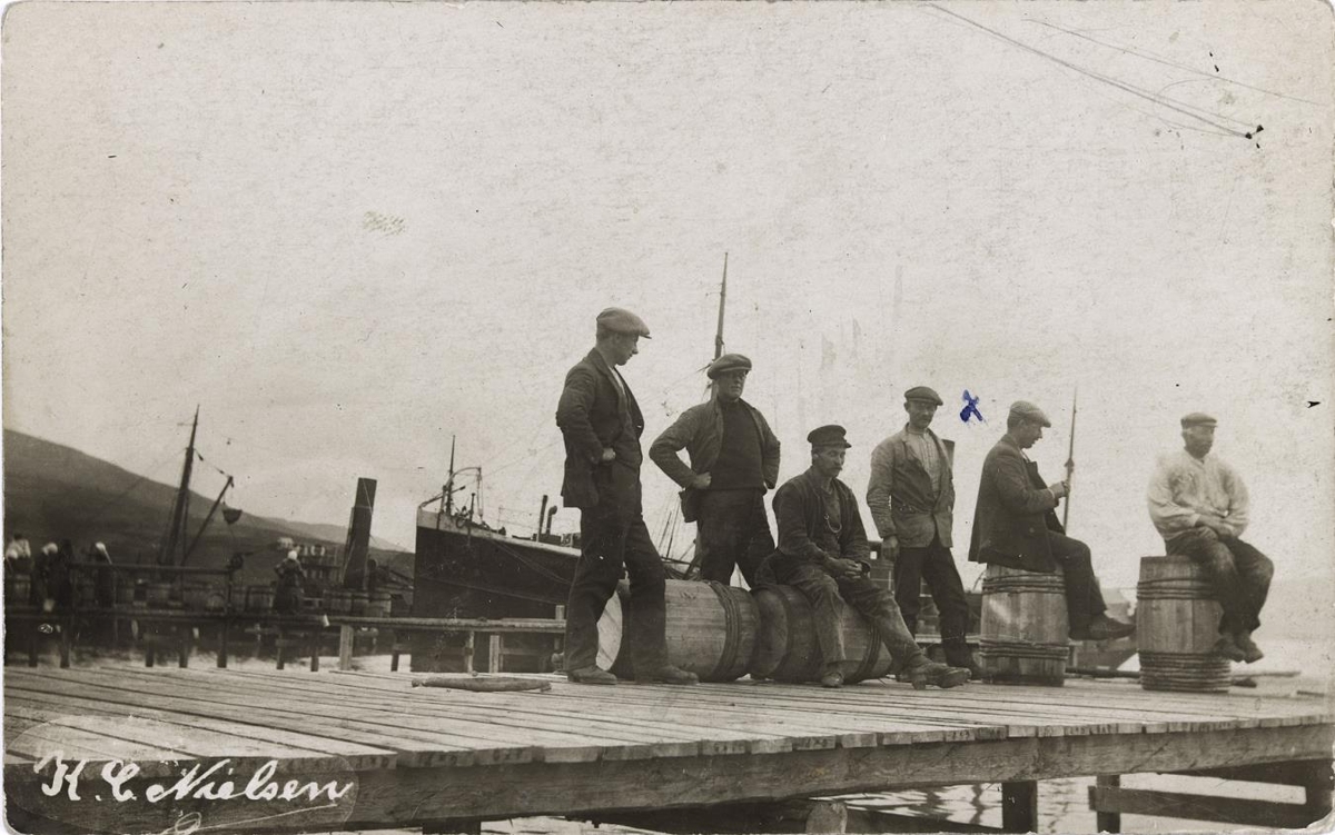 Hópur karlmanna situr á trétunnum á trébryggju, bátar og gufutogarar í baksýn. Neðst t.v. er skrifað í filmuna: K. C. Nielsen. Merkt er með penna milli tveggja mannanna og á bakhlið er skrifað með sama penna: Stanley vinstra megin við krossinn.