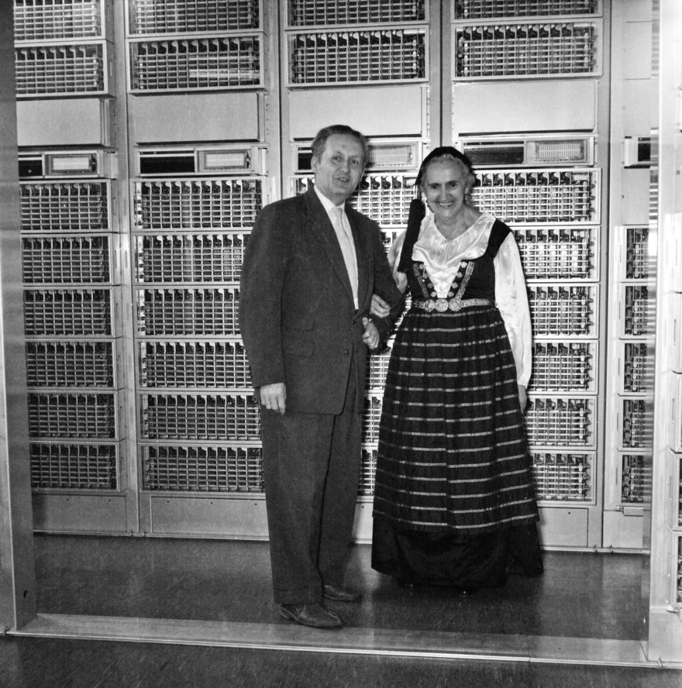 Jón Tómasson, símstöðvarstjóri, og Marta Valgerður Jónsdóttir, forveri hans í starfi og fyrsti símstöðvarstjórinn í Keflavík, í nýju símstöðinni árið 1960