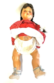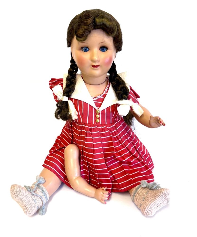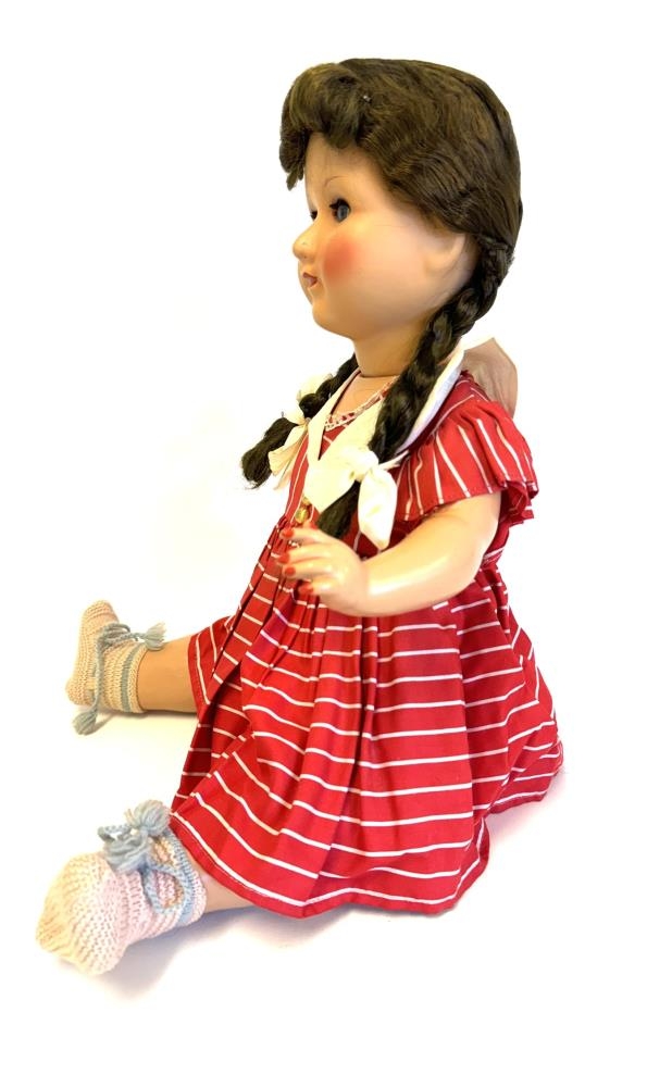 Brúða, stór, í rauðum kjól með hvítum röndum og hvítum kraga. Hvítur undirkjóll og nærfatnaður. Brúnt hár í tveimur fléttum með hvítum borðum. Heklaðar hosur, hvítar með bláum böndum. Önnur hendin brotin. Útlimir sveigjanlegir, augun lokast þegar henni er hallað og hún hefur líklega gefið frá sér eitthvað hljóð sbr. opin á maganum.