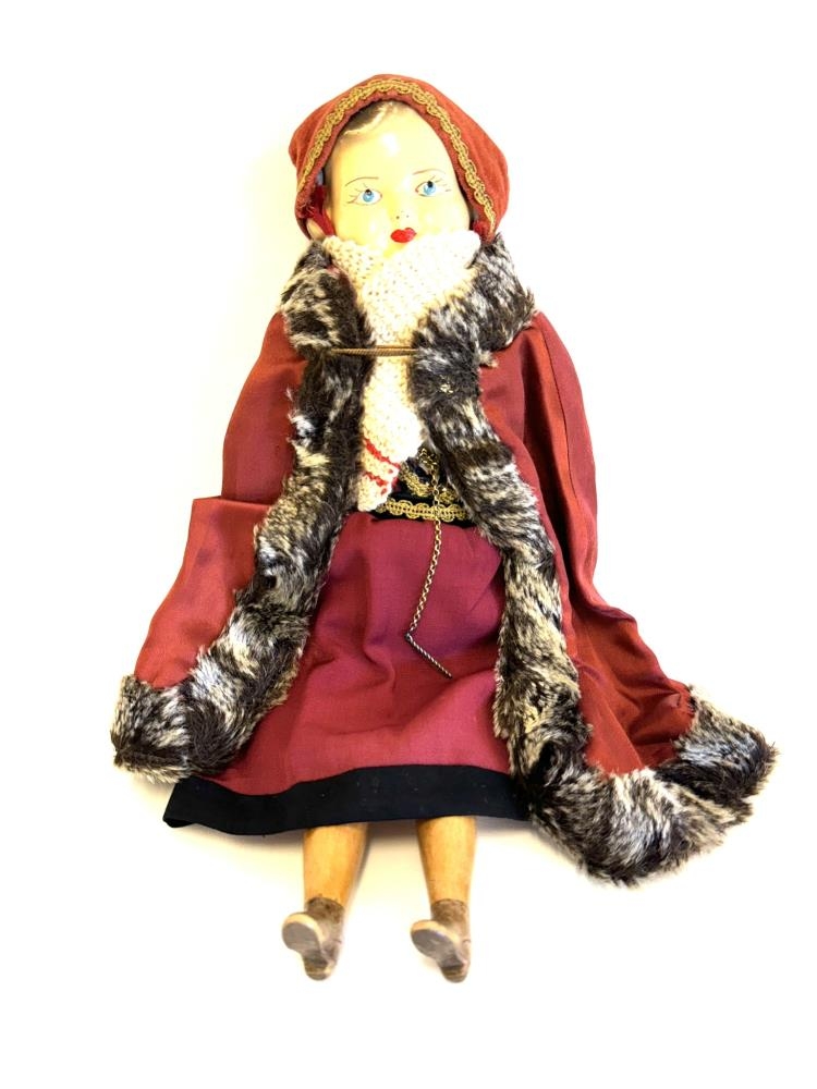 Dúkka sem heitir Gunna. Hún er líklega heimagerð af ömmu Guðnýjar. Dúkkan er í rauðum fatnaði, ,,silki,, möttli með svörtum ,,skinn,, kannti. Prjónaður ljós trefill stór. Kjóllinn er rauður þjóðbúningur, upphlutur með gylltum festingum. Hvít blómaskyrta. Rauður hattur. Búkurinn er úr hvítu efni en fætur, hendur og haus eru úr tré.