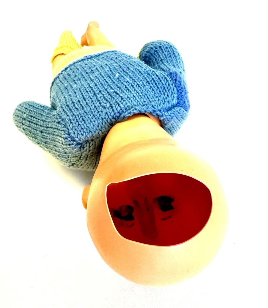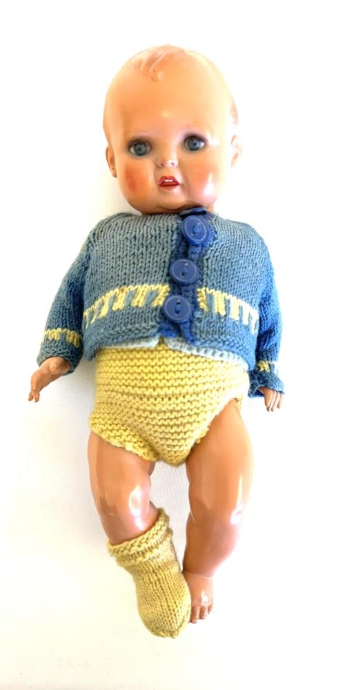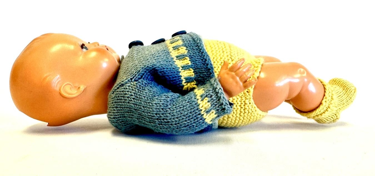 Lítil plast brúða í prjónuðum fötum. Útlimir beigjast. Dúkkan er í blárri peysu með gulu mynstri, þrjár bláar tölur. Gular stuttar buxur/brók og gul hosa, vantar aðra. Stórt stykki aftan af höfði brúðunnar er brotið.