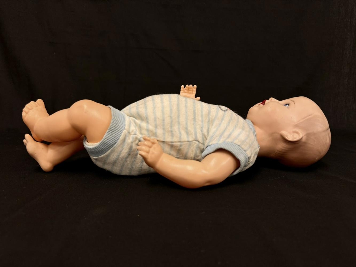 Dúkka úr plasti, hægt að hreyfa hendur og fætur. Er í stutterma samfellu með smellum í klofi, hvít í grunninn með bláum röndum.