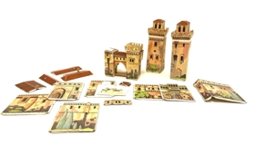 Líkan úr pappa. Samsettir 3 hlutar kastala, tveir turnar og kastalabygging. Margar lausar hliðar og þök.