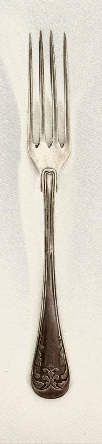 Silfurlitaður lítill gaffall, kökukaffall. Fíngert munstur á endanum og máð áletrun, líklega Þyri (Þyri Eydal)