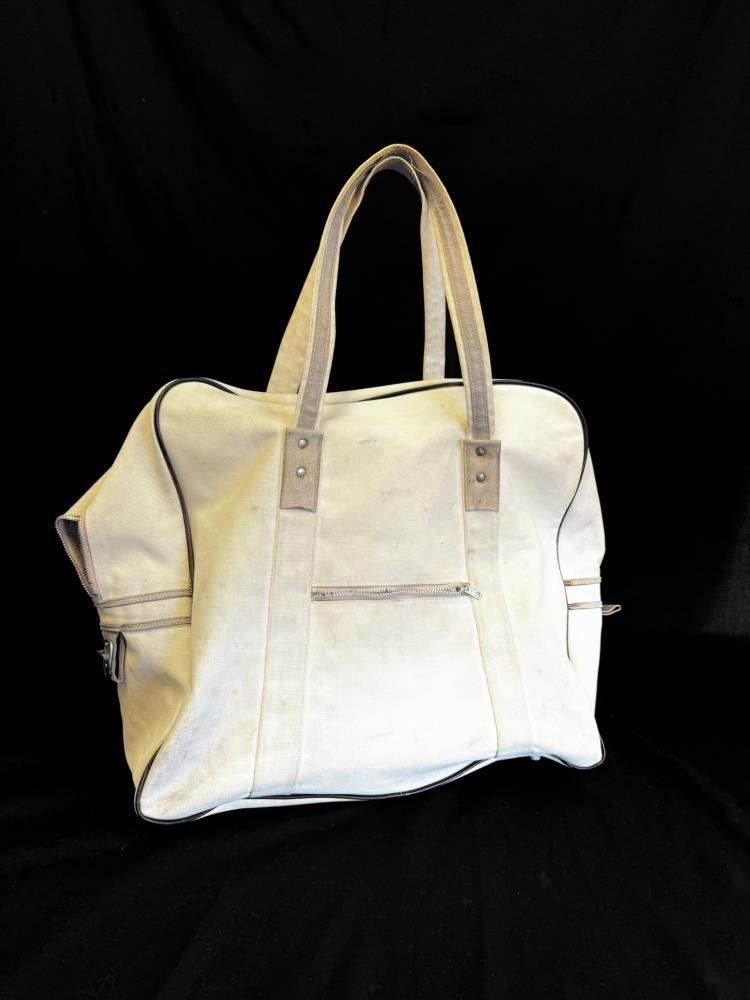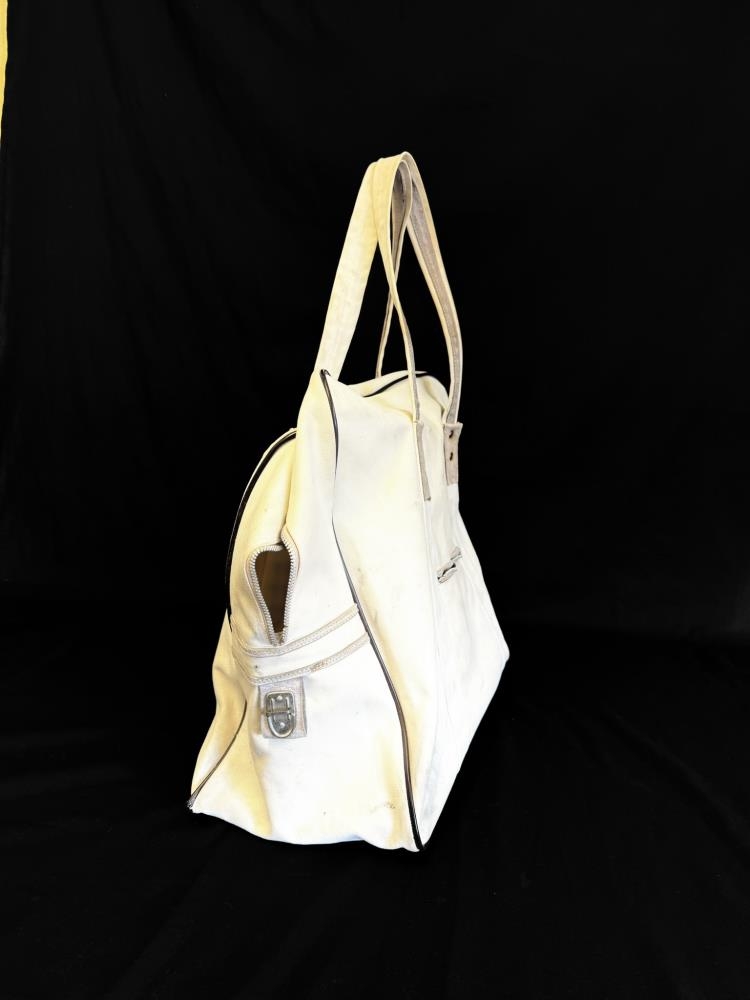 Hvít tau taska með stórum haldföngum. Lítið hólf öðru megin með járn rennilás. Leðurstyrkingar við haldföng.
