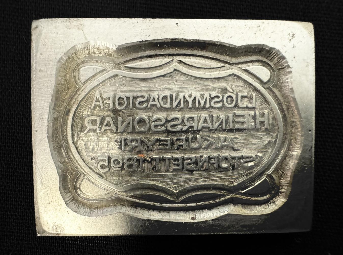 Lítill stimpill úr málmi. Flatur og ferhyrndur. Öll platan grafin út og á henni stendur : Ljósmyndastofa. H. Einarssonar. Akureyri. Stofnsett 1895.
