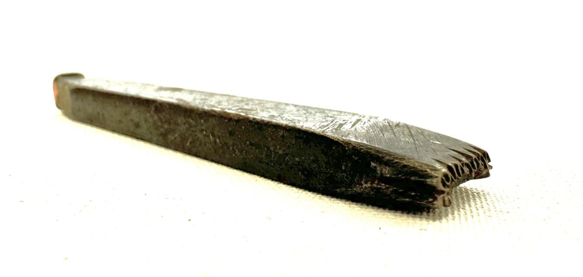 Stimpill. Aflangt járnstykki með mjög smárri áletrun á öðrum enda, ólæsileg.