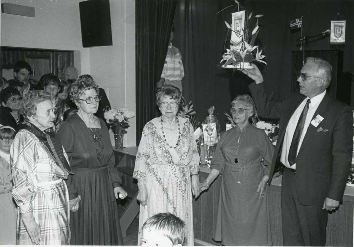 Hátíðardagskrá í samkomuhúsinu í Garði. Finnbogi Björnsson þáverandi oddviti Gerðahrepps, afhendir fjórum heiðurskonum viðurkenningu, ekki er vitað um tilefnið. Myndin er úr safni Víkurfrétta ehf. vikublað á Suðurnesjum.