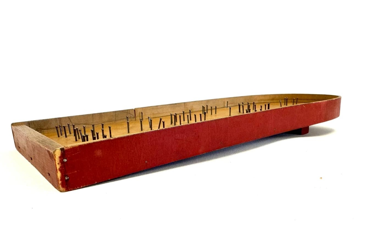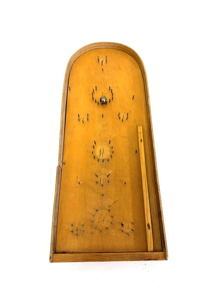 Kúluspil, spjald með köntum og efri hluti bogalaga. Spýta undir efri enda til að spjaldið tyllist upp. Naglar negldir í spjaldið þannig að þeir mynda hálfhringi sem málmkúlan geti dottið ofan í þá. Tölur eru skrifaðar með blýaanti við körfurnar. Hliðar spilsins eru málaðar rauðar. Spilið smíðaði Dýrleif sjálf í Barnaskólanum.
