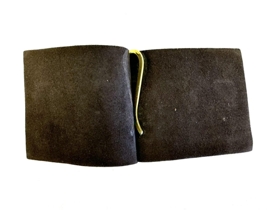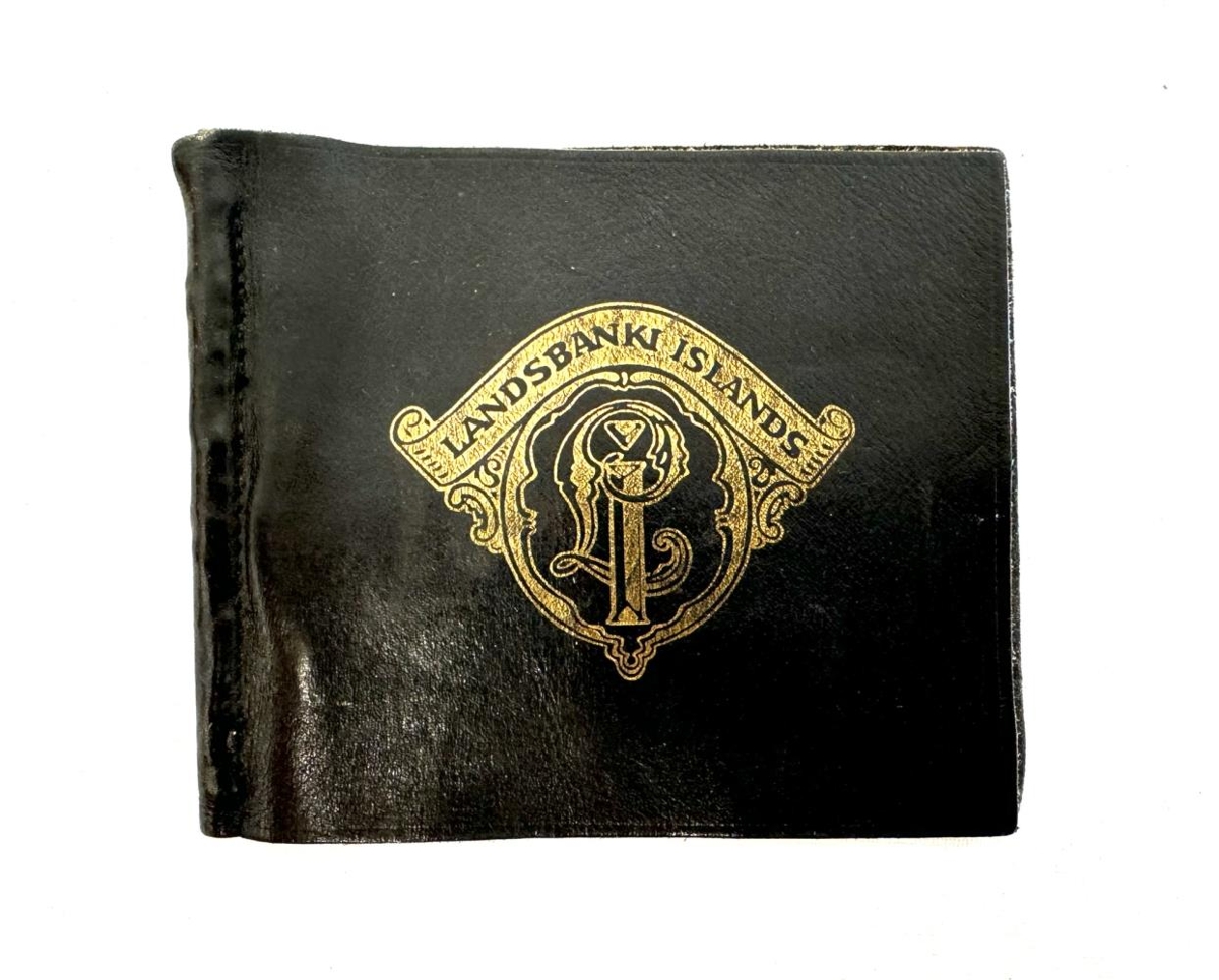 Lítið seðlaveski úr svörtu þunnu leðri. Veskið er einfallt, lagt saman, í miðjunni er gyllt klemma. Líklega bara ætlað til að leggja seðla innan í og klemman heldur þeim þá á sínum stað. Gyllt áletrun og skraut, Skrautlegt L innan í þríhyrningslaga merki sem á stendur ,,Landsbanki Íslands,,