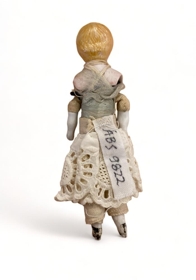 Lítil postulínsbrúða. Brúðan er með höfuð og útlimi úr postulíni. Líkami er úr taui. Í undirpilsi úr blúndu.