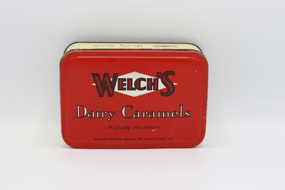 Ferkantað, rúnað málmbox. Rautt og kremað á lit. Á lokinu stendur "Welch's dairy caramels a quality assortment made in Tynemouth, england by Welch & sons ltd". Á framhlið og bakhlið stenudr "Welch's quality sweets". Á vinstri hlið stendur "Only the finest materials optainable are used in the manufacture of our quality sweets and toffees" og undirskrift framleiðanda. Á hægri hlið stendur "Contents 1 lb nett. Made in England by Welch & sons ltd., Tynermouth".